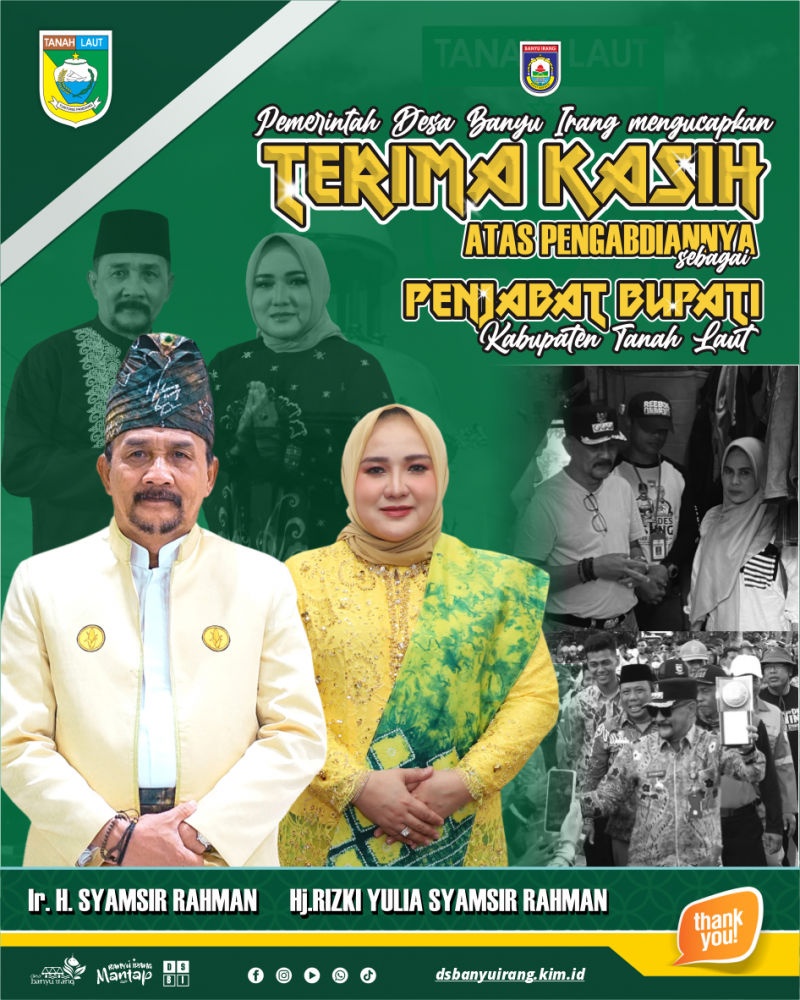 Pemerintah Desa Banyu Irang mengucapkan Terima Kasih kepada Pj. Bupati Tanah Laut, Bapak Ir. H. Syamsir Rahman dan Pj. Ketua TP-PKK Tanah Laut, Ibu Hj. Rizki Yulia Syamsir Rahman atas kepemimpinan dan pengabdian yang telah didedikasi untuk kemajuan dan kesejahteraan masyarakat Bumi Tuntung Pandang khususnya di Desa Banyu Irang.
