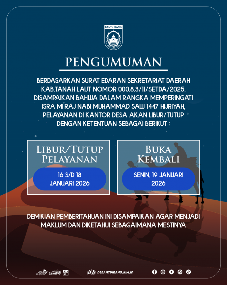 Pemberitahuan Tutup Pelayanan Kantor Desa Banyu Irang dalam rangka Peringatan Isra Mi'raj 1447 H