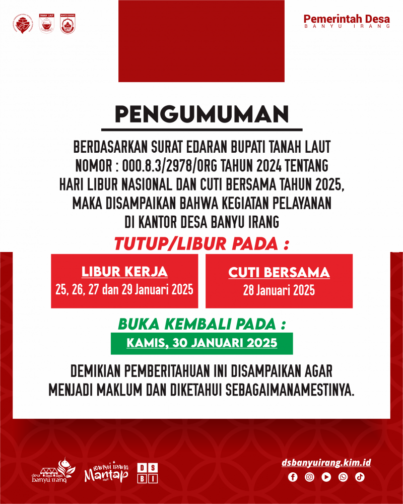 Kegiatan Pelayanan di Kantor Desa Banyu Irang Tutup sehubungan dengan hari libur Isra Mi'raj dan Tahun Baru Imlek 2025.