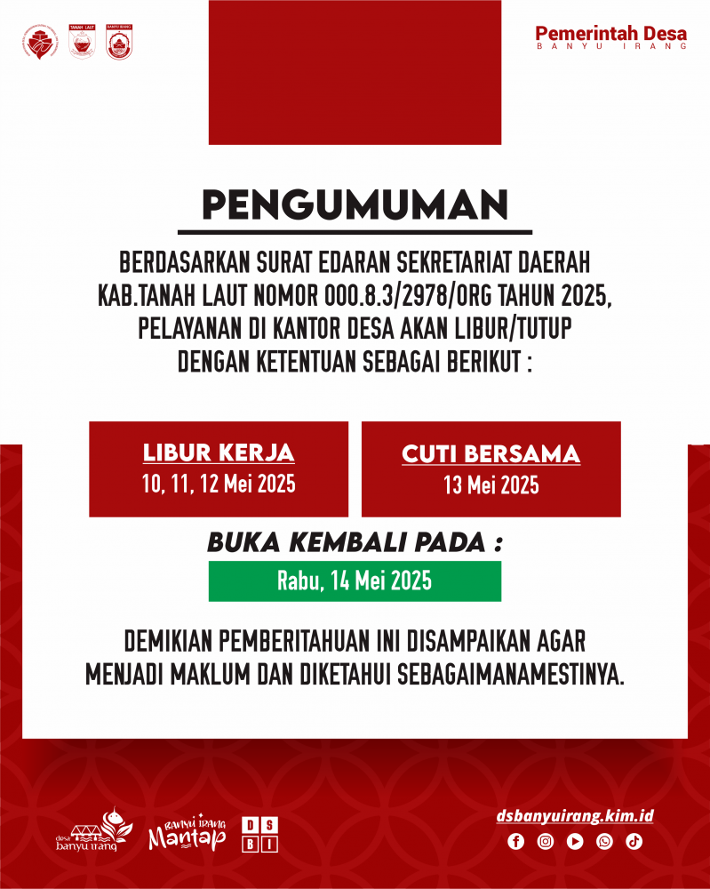 Sehubungan dengan Surat Edaran Sekretariat Daerah Kabupaten Tanah Laut Nomor 00.8.3/2978/Org Tahun 2024 tentang Hari Libur Nasional dan Cuti Bersama Tahun 2025 dengan ini disampaikan pengumuman Libur dan Cuti Pelayanan Kantor Desa Banyu Irang.