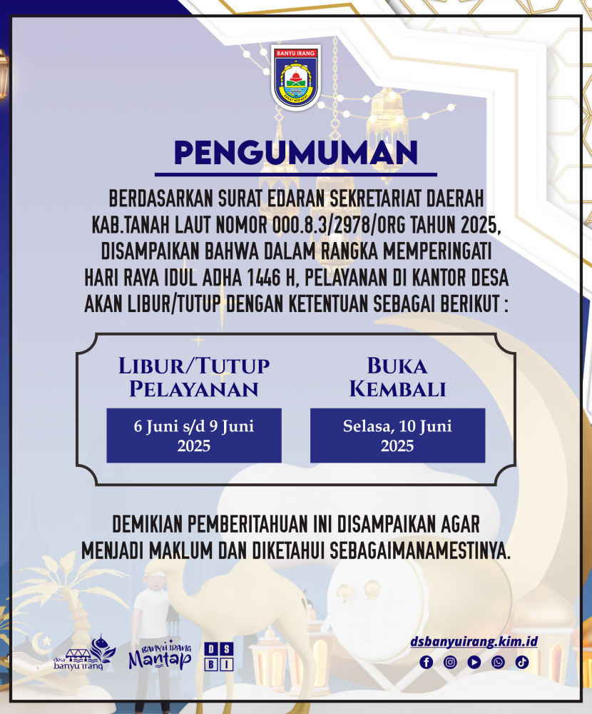 Pengumuman Libur Pelayanan Kantor Desa Banyu Irang dalam rangka Hari Raya Idul Adha 1446