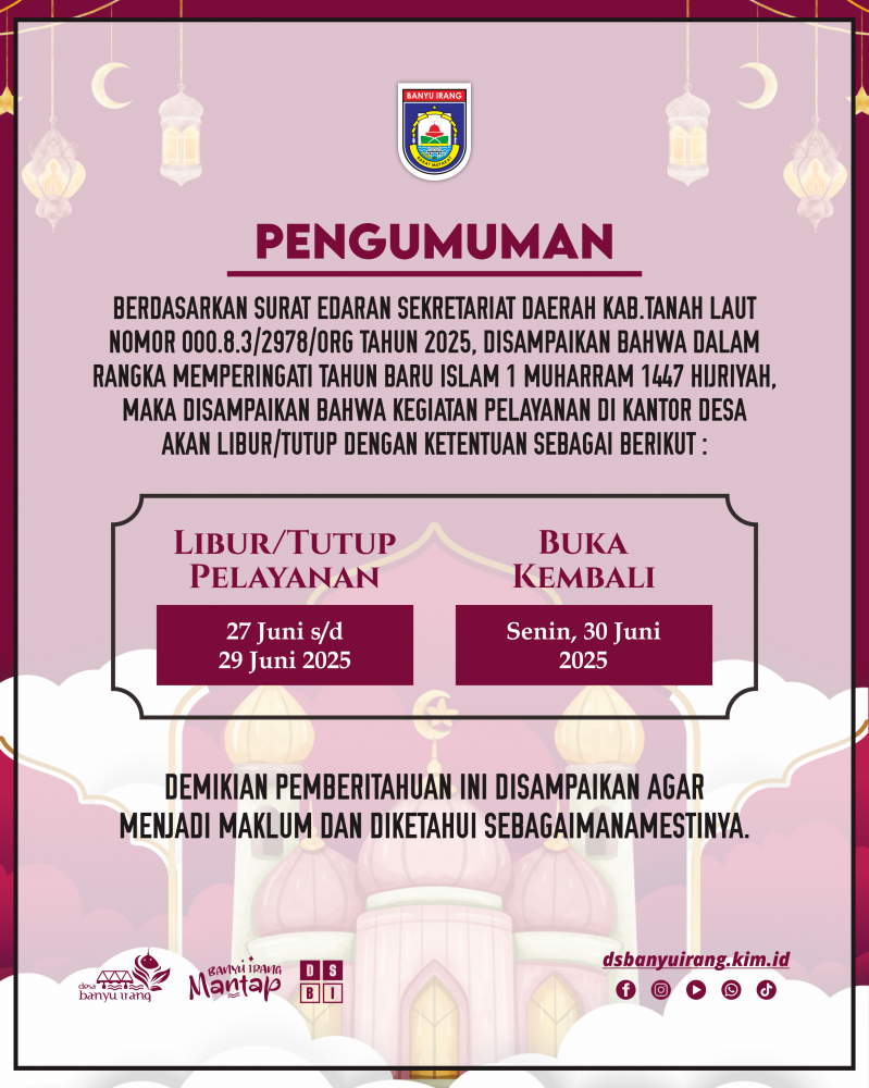 Pengumuman Libur Pelayanan Kantor Desa Banyu Irang dalam rangka memeringati Tahun Baru Islam 1 Muharram 1447 Hijriyah