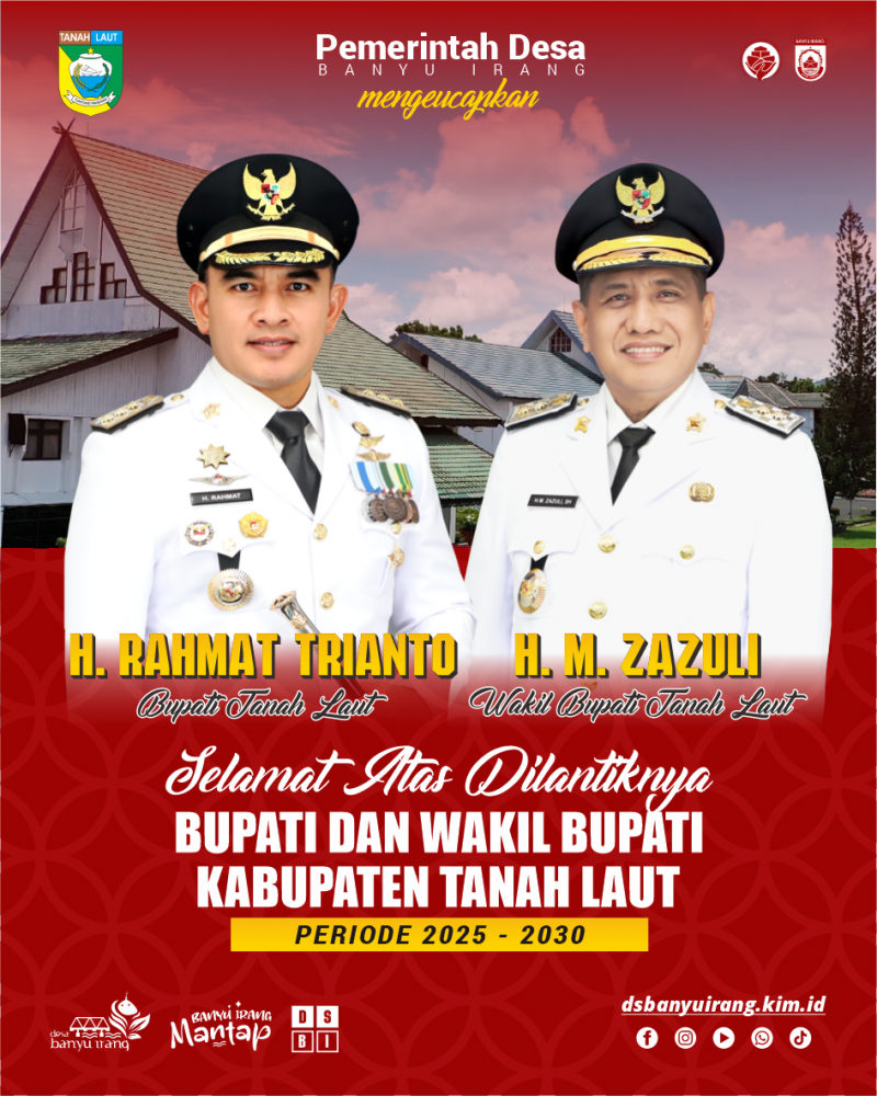 Pemerintah Desa Banyu Irang mengucapkan Selamat dan Sukses Atas dilantiknya Bupati dan Wakil Bupati Tanah Laut, Bapak H. Rahmat Trianto dan H. M. Zazuli Periode 2025 - 2030.